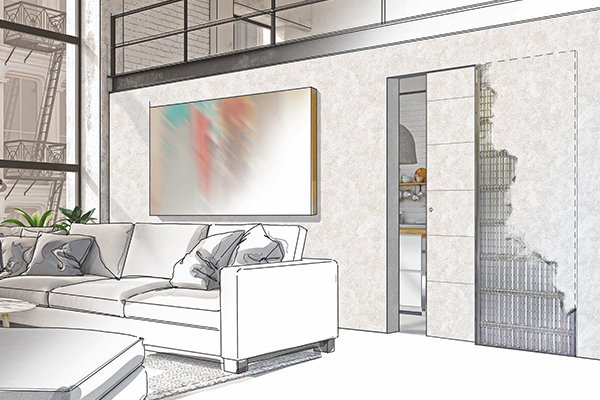 Grâce à un châssis solide et un rail en aluminium robuste, la gamme NEW SPACE permet de faire disparaitre la porte hors et dans le mur, de manière optimale et silencieuse.