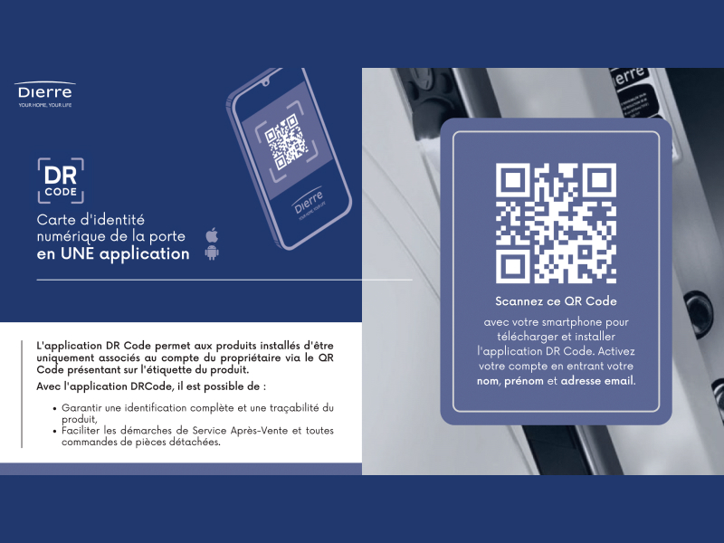 Découvrez dès à présent notre toute nouvelle application mobile DRCode. Véritable carte d’identité numérique de la porte, cette application permet aux produits installés d’être associés au compte de leurs propriétaires afin de garantir une identification et traçabilité du produit tout en facilitant les démarches de SAV et commandes de pièces détachées.
