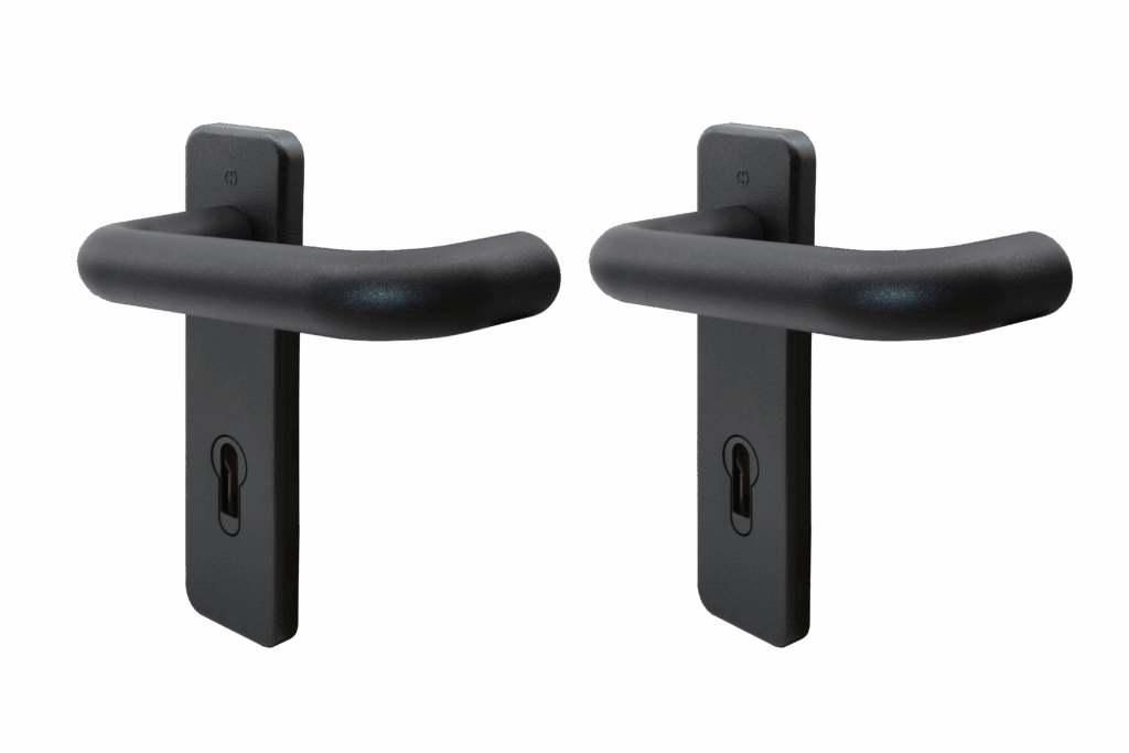 Béquille et bouton fixe sur plaque en plastique noir pour recevoir un cylindre européen traversant.