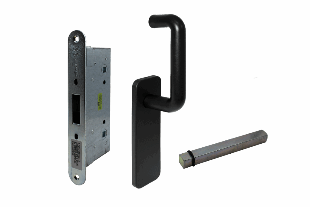 Kit crémone pompier pour vantail semi-fixe comprenant une contre-serrure, un demi-carré anti-panique, une demi-béquille et une plaque aveugle en finition acier inox.