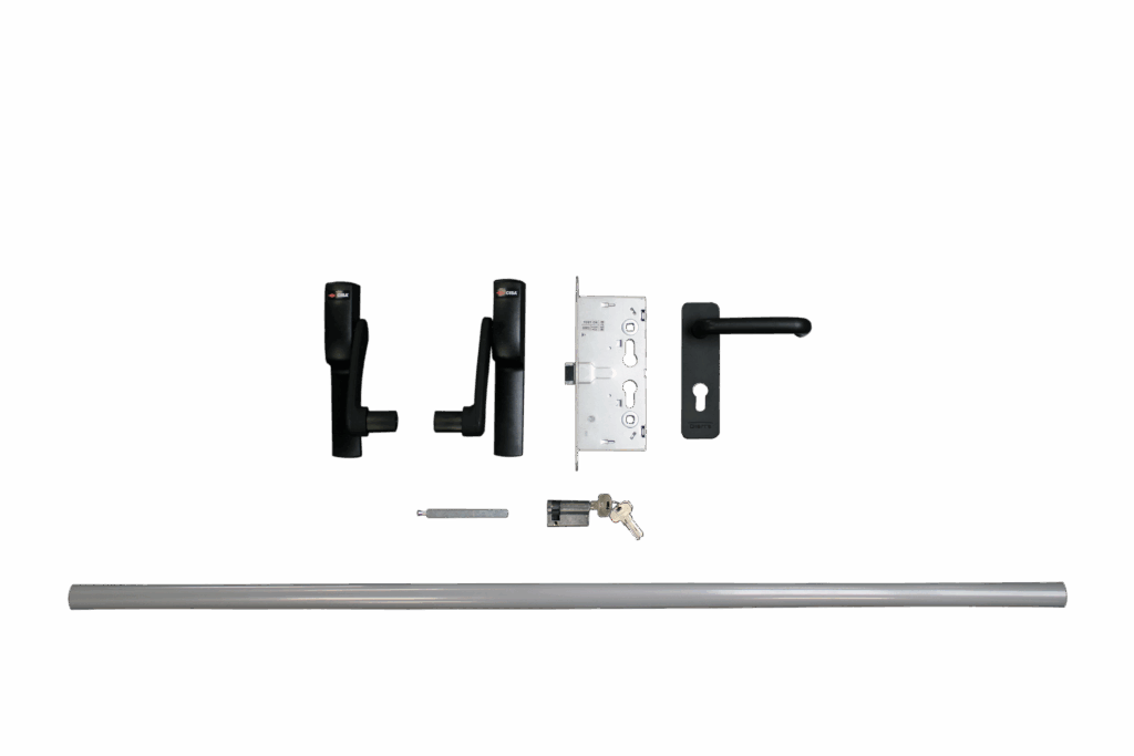Kit anti-panique à barre avec bouton fixe extérieur noir, son demi-cylindre européen extérieur et sa serrure anti-panique.