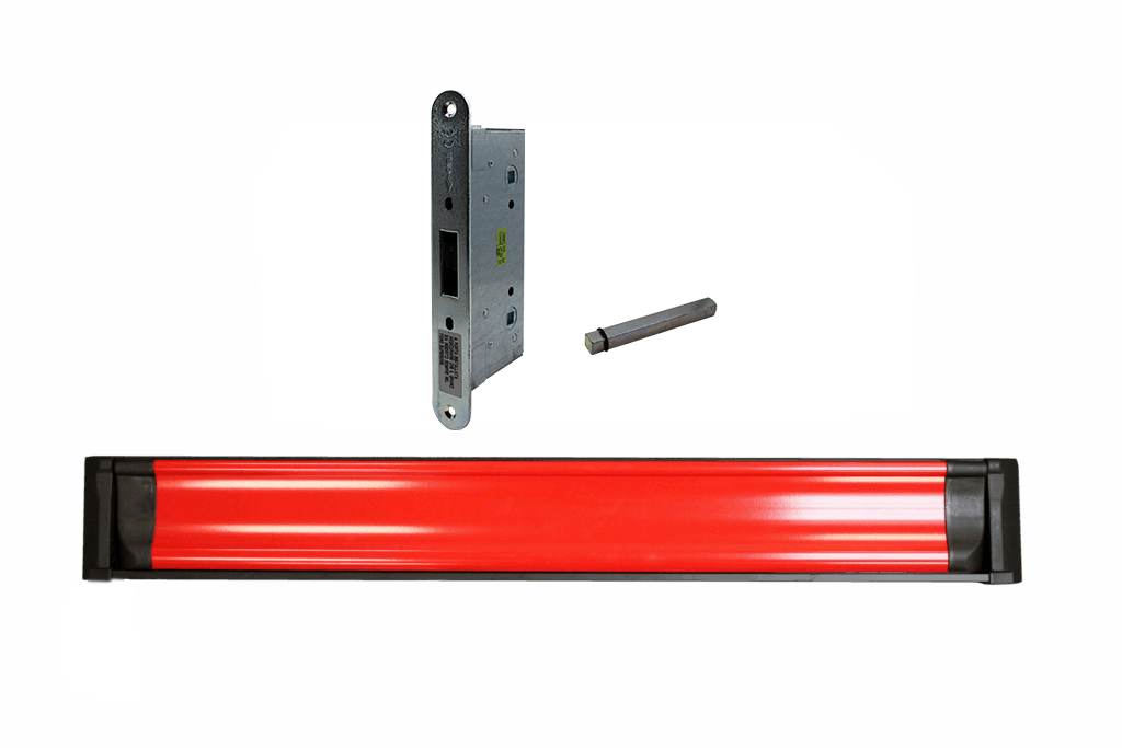 Kit anti-panique push No Panic avec béquille extérieure noire, son demi-cylindre européen extérieur et sa serrure anti-panique.