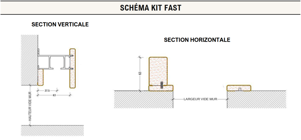 Le KIT FAST vient compléter notre gamme de châssis à galandage. En effet, l’ensemble de nos autres modèles ont été conçus pour être inséré à l’intérieur d’un mur à enduire ou d’une cloison en plaques de plâtre. Le KIT FAST permet de répondre à un nouveau besoin auquel les autres châssis ne peuvent pas répondre : il vient s’installer en applique à l’extérieur de la cloison et permet ainsi au vantail installé (non fourni) non pas de coulisser dans le mur mais de glisser le long de ce mur.