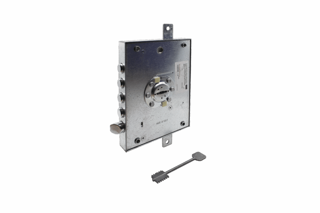 Serrure encatsrée HEAVY à double panneton. Poussante gauche avec kit MIA + 3 clés courtes. Configuration pour panneaux lisses 7+7 mm. Axe à 73.